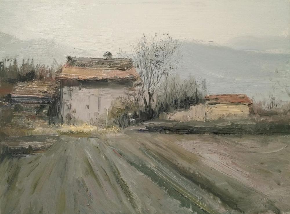此作品是典型的灰色调,表现了南方田园农家的阴天景色。